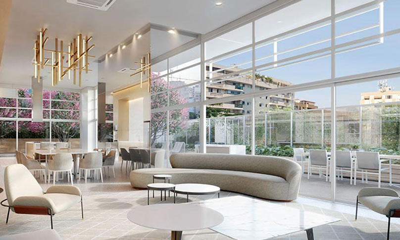 A imponência da fachada se estende ao lobby de acesso, com pé-direito elevado, iluminação diferenciada e uso de materiais claros, unindo-se à característica acolhedora dos tons em madeira.