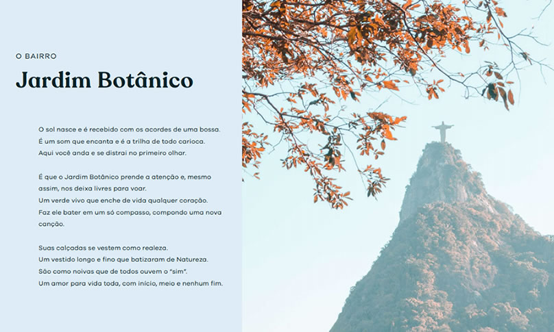 o Jardim Botânico. Um misto de sofisticação, leveza, contemporaneidade e, claro, poesia. Mas isso só é possível graças a grandes parceiros que enxergam o projeto como um todo, sem abrir mão dos detalhes, tornando cada um deles em um empreendimento único.