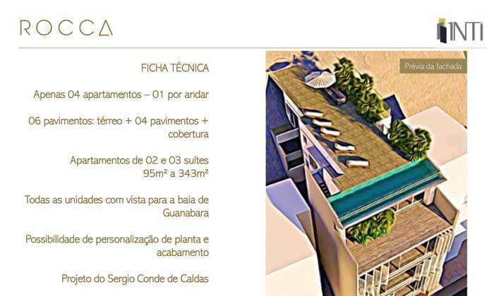 Apenas 04 apartamentos – 01 por andar – 06 pavimentos: térreo + 04 pavimentos + Cobertura. Apartamentos de 02 e 03 suítes de 95 metros quadrados a 343 metros quadrados. Todas as unidades com vista para a baía de Guanabara. Possibilidade de personalização de planta e acabamento.