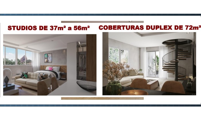 Apartamentos Garden, Studio, Double Suítes e Coberturas Duplex.