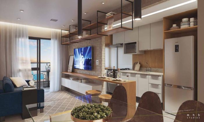 •Sonorização ambiente nos apartamentos, com amplificador de parede em display LCD, com controle remoto e entradas para SD Card, USB e Bluetooth. O display comandará a caixinha de som da sala e da varanda. permitindo que se coloque música na sala através de um smartphone, por exemplo, e a música toque na sala e na varanda Caso o morador tenha TV com saída de som analógica na sala, ela poderá ser conectada à caixinha de som da sala e da varanda