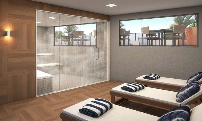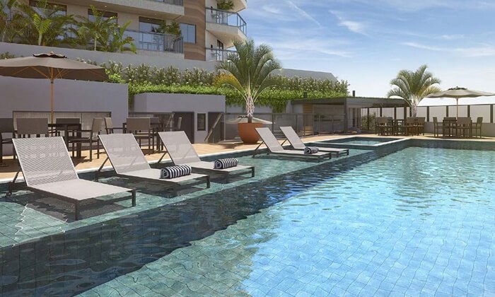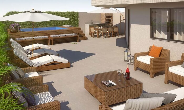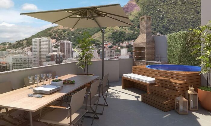 • Kit Terrace para upgardens e coberturas – Composto de churrasqueira a carvão, bancada, piscina de fibra e deck.